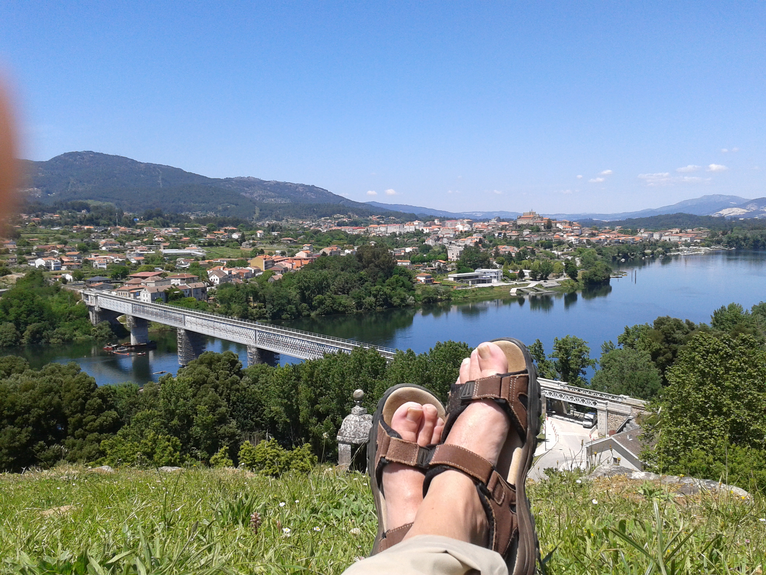 Bin heute dann doch nicht mehr nach Galizien gelaufen und habe mir Valença ein einfaches Zimmer gesucht. Neben der Unterkunft war auch eine Lavanderia, die mir meine Wäsche für 3 Euronen gewaschen haben. Anschliessend auf der Festung „Valença Fortaleza“ gewesen und mir den Grenzfluss Minho mit der Friedensbrücke zwischen Portugal Spanien von oben angesehen. Dort werde ich dann morgen auch spanischen Boden betreten. Heute nur noch die Wäsche abholen, nen Happen essen, 1 – 2 Cerveza zur Verperlung bringen und das Knie und Knöchel massieren. Dann Feierabend.